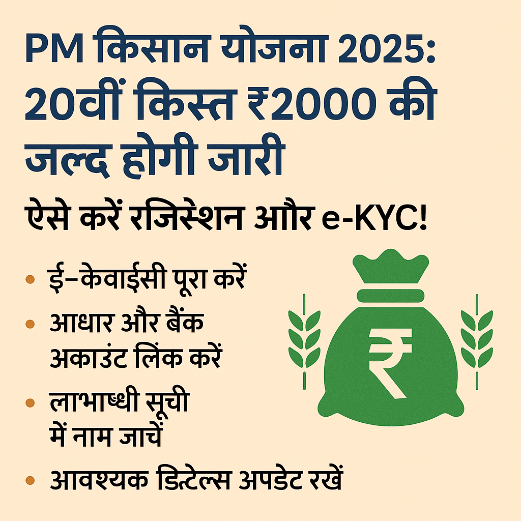 20वीं पीएम–किसान किस्त – ₹2,000 – 20 जुलाई तक आ जानी चाहिए, बशर्ते आपने अपना ई-केवाईसी, आधार-बैंक लिंकिंग और लाभार्थी चेक कर लिया हो। आज ही ये काम करें ताकि आप चूक न जाएं!