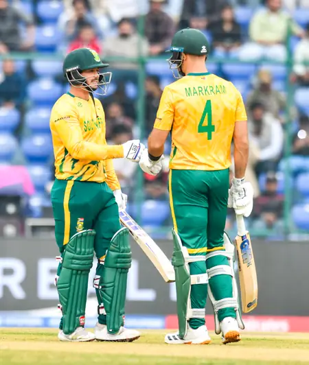 ओपनिंग जोड़ी मार्करम-डिकॉक ने 3 ओवर में 32 रन जोड़े। मार्करम 11 गेंद 28 रन (5 चौका, 1 छक्का) बनाकर आउट। डिकॉक 16 गेंद 14 रन पर 56/2 पर लौटे।