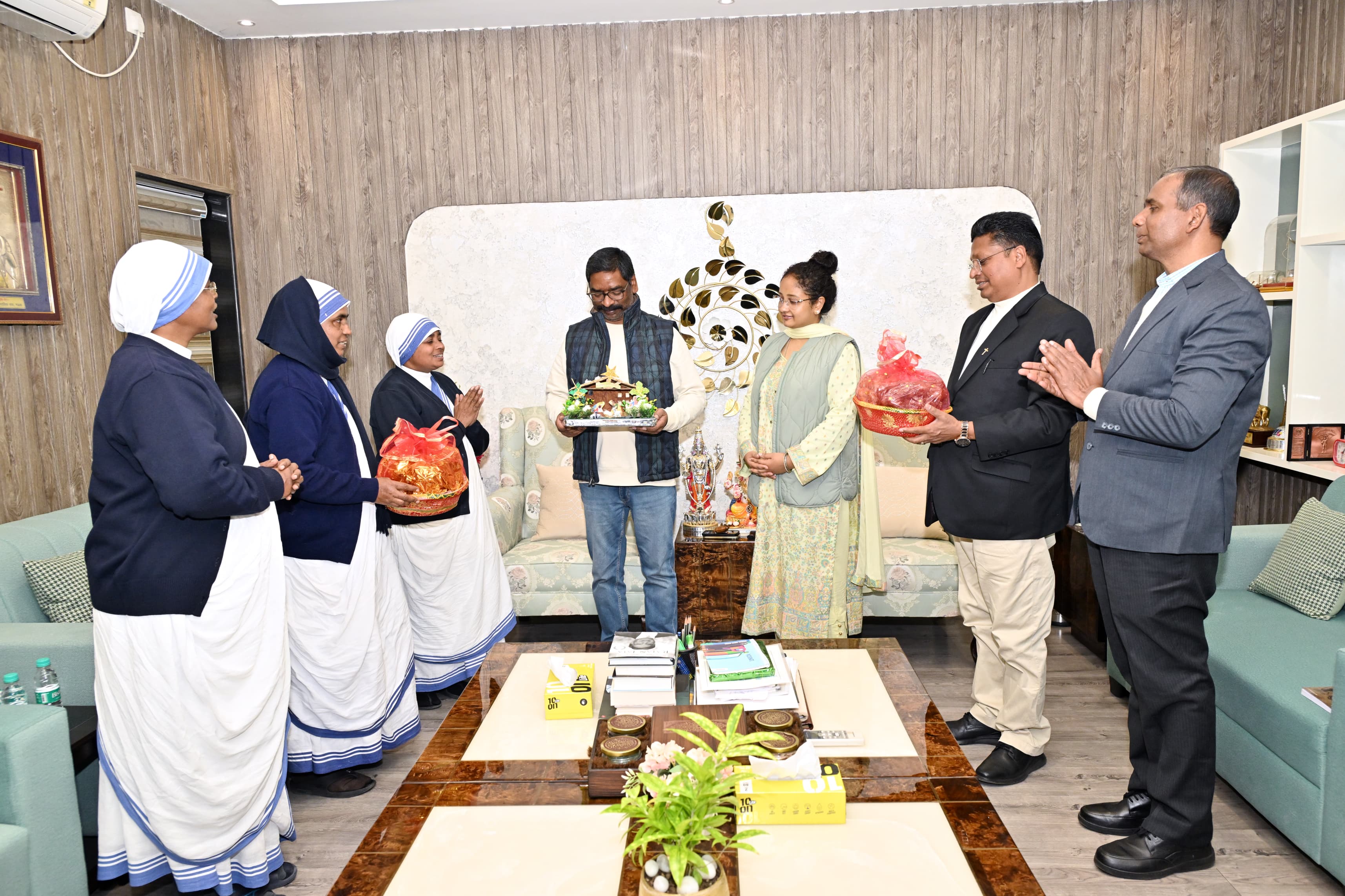 मुख्यमंत्री श्री हेमन्त सोरेन एवं विधायक श्रीमती कल्पना सोरेन से आज मुख्यमंत्री आवासीय कार्यालय में फादर अजीत खेस एवं फादर मेडॉट तथा मिशनरी ऑफ चैरिटी की रिजनल सुपीरियर सिस्टर जोस स्लेटा, सिस्टर मारिया अगस्ता तथा सिस्टर ग्वालबट ने शिष्टाचार भेंट कर क्रिसमस उत्सव सेलिब्रेट किया । उन्होंने एक -दूसरे को प्रभु यीशु के आगमन की खुशी में मनाए जा रहे क्रिसमस पर्व की हार्दिक बधाई और शुभकामनाएं दी।